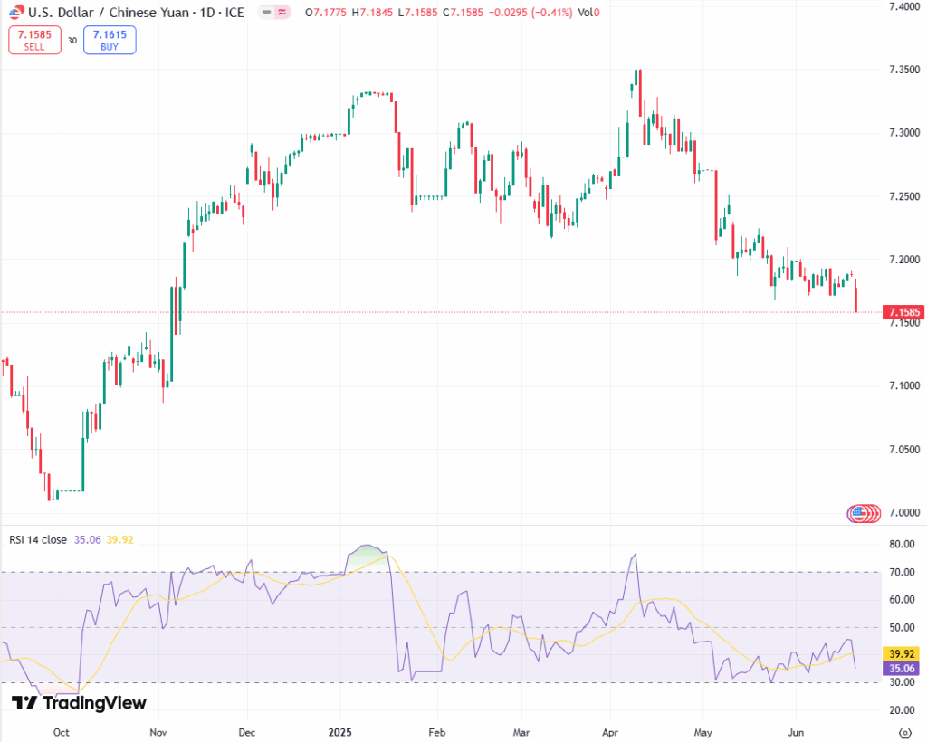 CNY tăng nhẹ lên ~7.18/USD, chủ yếu là USD yếu đi. Nhân dân tệ vẫn mất giá gần 7% so với USD trong 12 tháng qua.