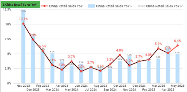 - Tăng mạnh 6.4% YoY, cao hơn kỳ vọng (5%) và tháng trước (5.1%) — mạnh nhất kể từ 12/2023.
