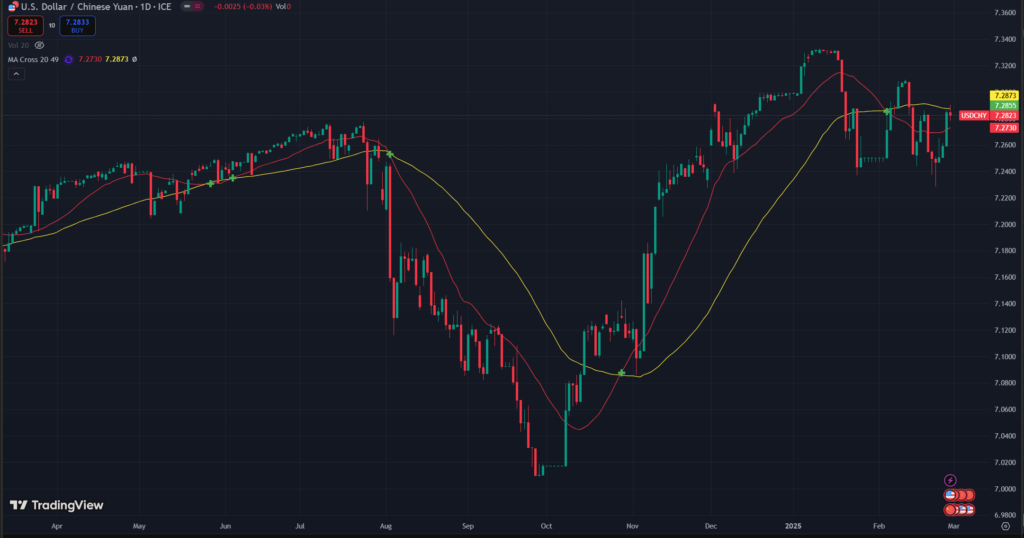 - Tình hình: Nhân dân tệ giảm mạnh sau tin tức thuế quan mới nhưng sau đó hồi phục lên 7.28 CNY/USD.