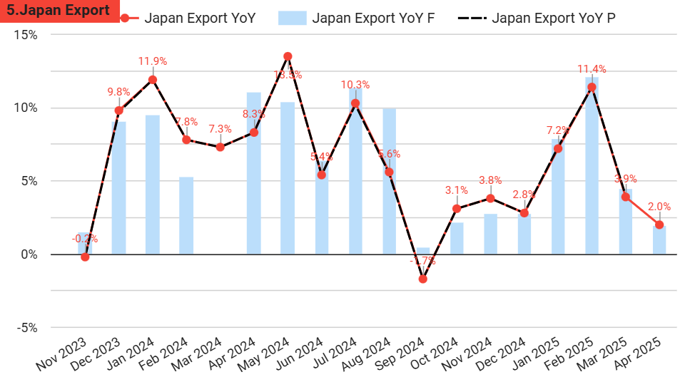 - Xuất khẩu tăng 2% so với cùng kỳ, đạt JPY 9.157,16 tỷ – đánh dấu tháng tăng trưởng thứ 7 liên tiếp nhưng là mức tăng thấp nhất trong chuỗi này do tác động từ thuế quan Mỹ 🇺🇸.