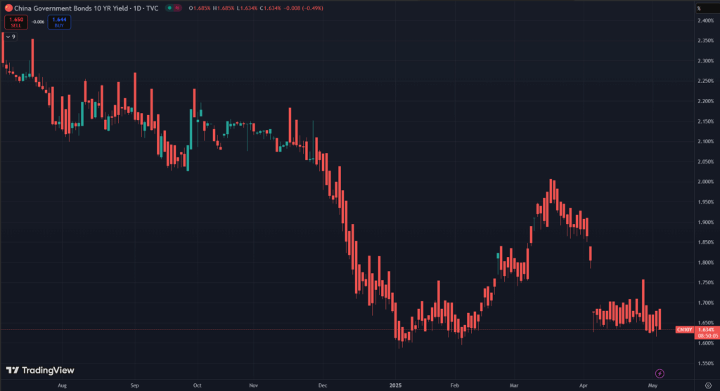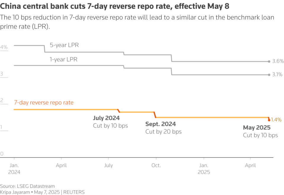 Vào ngày 7/5/2025, Ngân hàng Nhân dân Trung Quốc (PBoC) đã thông báo việc giảm lãi suất repo đảo ngược từ 1,5% xuống 1,4% và giảm tỷ lệ dự trữ bắt buộc 0,5 điểm phần trăm. Đây là một động thái nhằm tăng cường thanh khoản dài hạn cho nền kinh tế lớn thứ hai thế giới, với mục tiêu giải phóng ít nhất 1.000 tỷ nhân dân tệ (khoảng 139 tỷ USD).