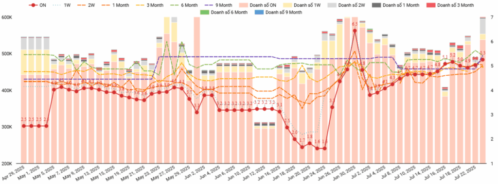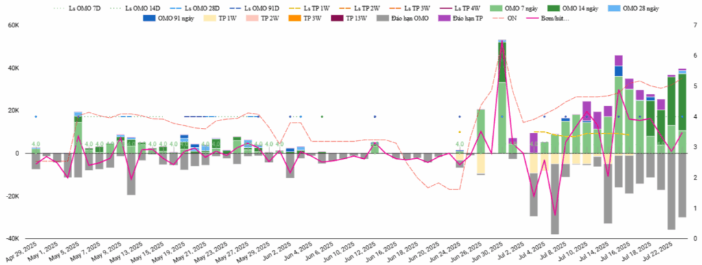 - Lãi suất qua đêm (ON) bật tăng từ đáy 1,6% (cuối tháng 6) lên ~5,3% (cuối tháng 7)