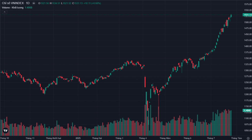 🔹 VN-Index tăng lên 1531 điểm, tăng 12,3% trong tháng và >23% YoY
